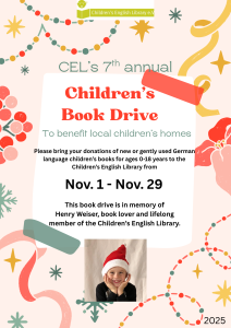 Our 7th annual Children’s Book Drive starts on Saturday November 1st and runs until Saturday November 29th. We are collecting new and gently used German language children’s books for ages 0-18. The books will be donated to children’s homes and organizations that support families in our community.