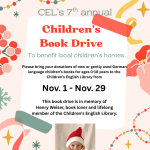 Santa will be at the library this Saturday. Come and get your picture taken with him, write a letter to the North Pole, and enjoy a treat from the bake sale. This activity is open to everyone so be sure to invite your friends. This is also the last day of our Children’s Book Drive so please bring in any donations by then.
